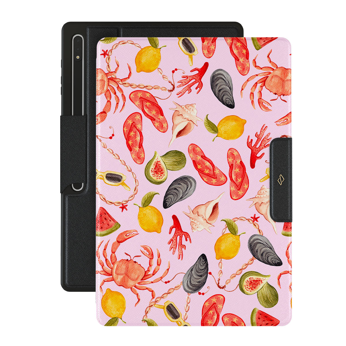Questo design include: anguria, occhiali da sole, frutti di mare, granchio, infradito, ostriche, limone, colori vivaci, tema tropicale