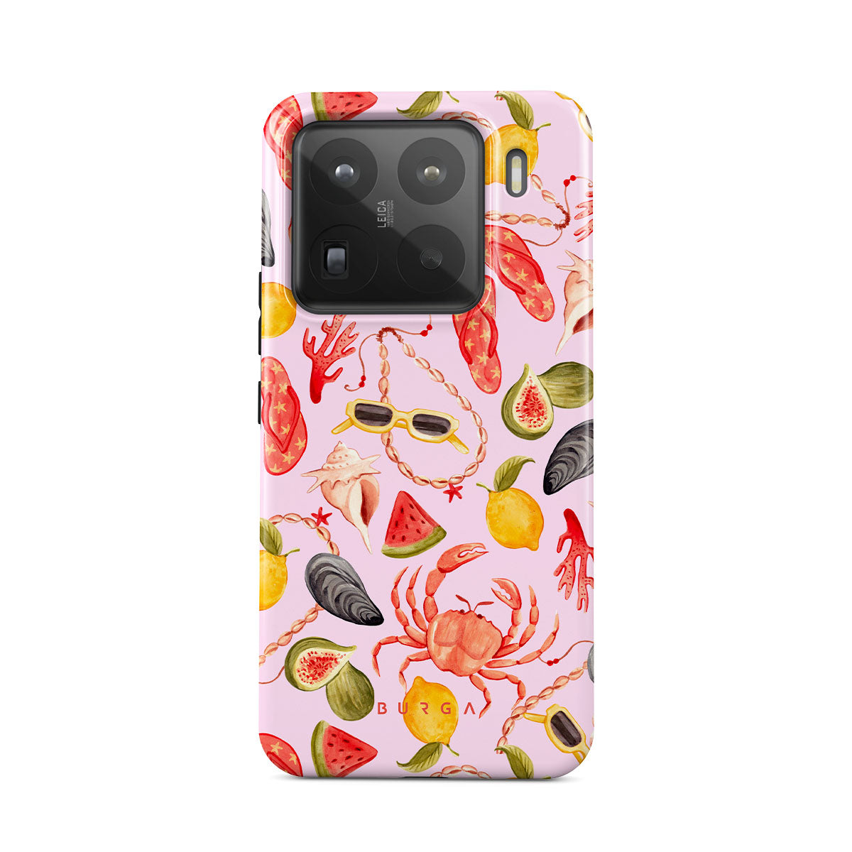 Questo design include: anguria, occhiali da sole, frutti di mare, granchio, infradito, ostriche, limone, colori vivaci, tema tropicale