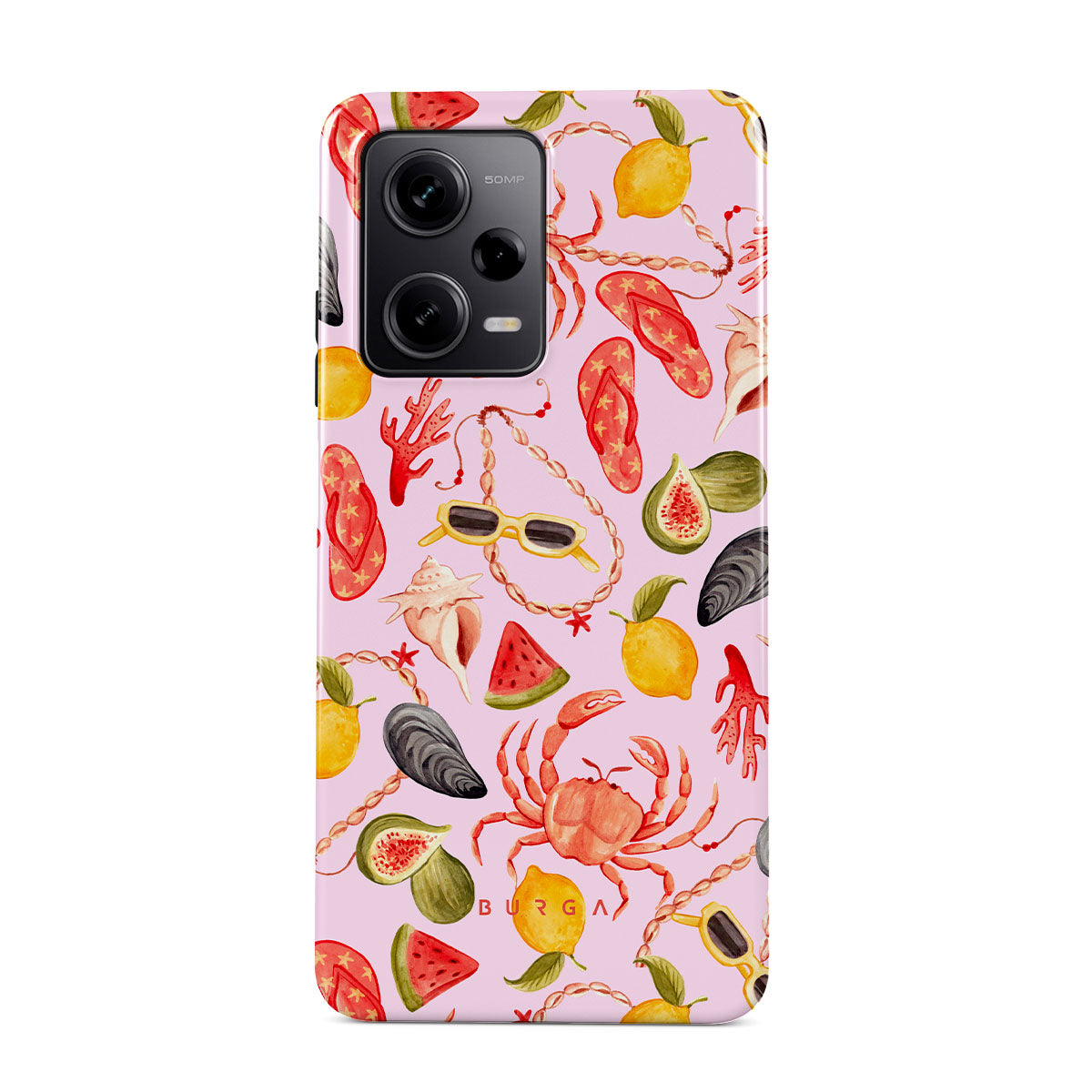 Questo design include: anguria, occhiali da sole, frutti di mare, granchio, infradito, ostriche, limone, colori vivaci, tema tropicale