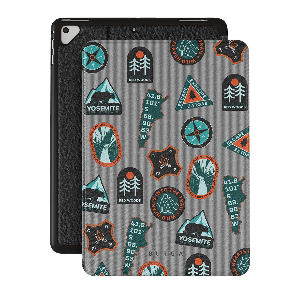 Questo design include: motivi a tema outdoor, natura, montagne, avventura, stile vintage, stemmi