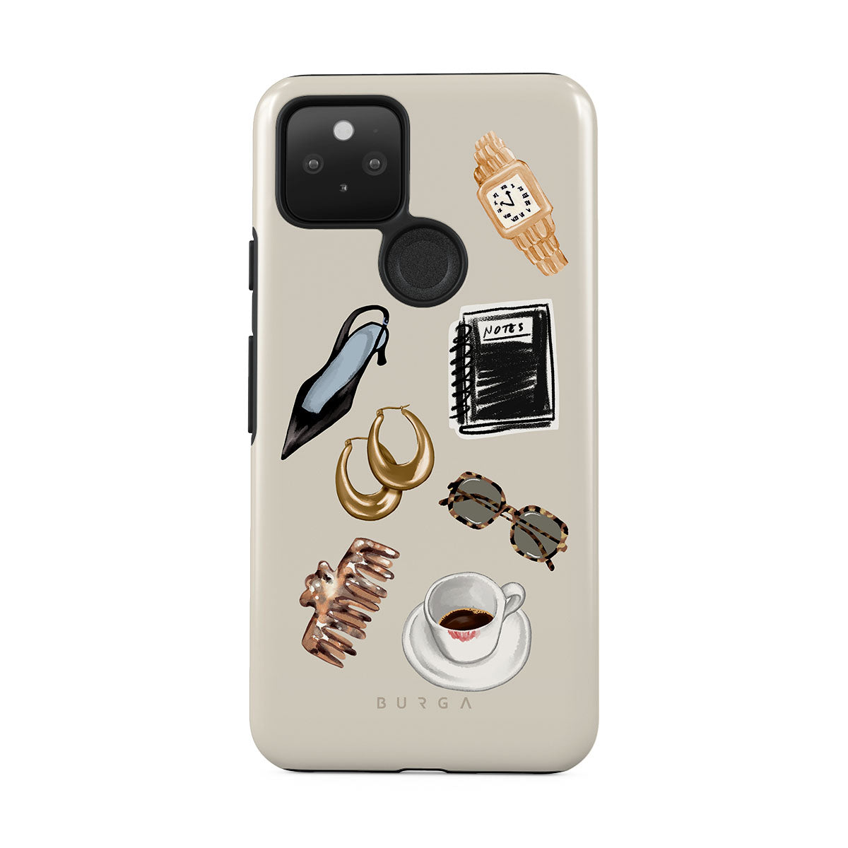 Questo design include: tacco alto nero, orecchini a cerchio dorati, taccuino nero, tazza di caffè, occhiali tartarugati, scrunchie marrone, orologio retrò dorato.
