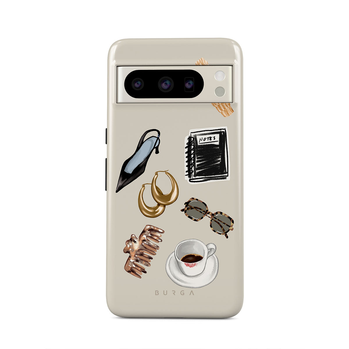 Questo design include: tacco alto nero, orecchini a cerchio dorati, taccuino nero, tazza di caffè, occhiali tartarugati, scrunchie marrone, orologio retrò dorato.