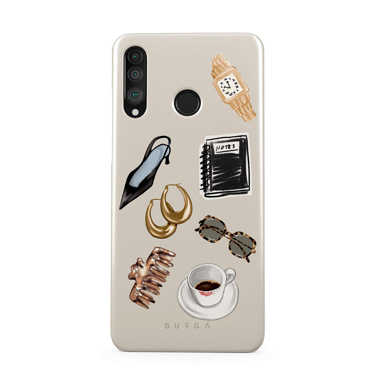 Questo design include: tacco alto nero, orecchini a cerchio dorati, taccuino nero, tazza di caffè, occhiali tartarugati, scrunchie marrone, orologio retrò dorato.