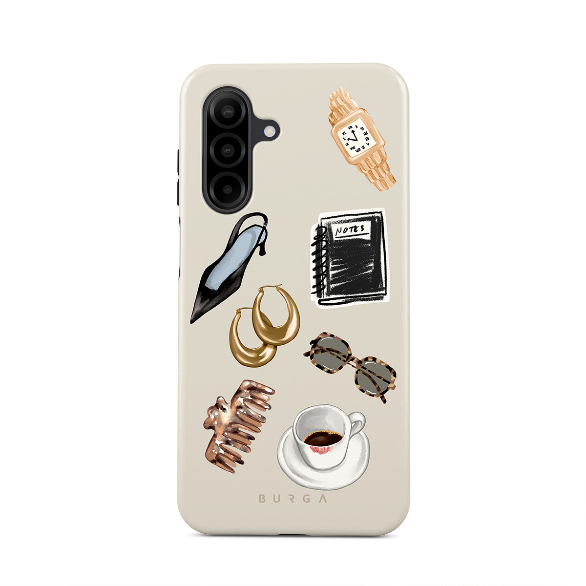 Questo design include: tacco alto nero, orecchini a cerchio dorati, taccuino nero, tazza di caffè, occhiali tartarugati, scrunchie marrone, orologio retrò dorato.