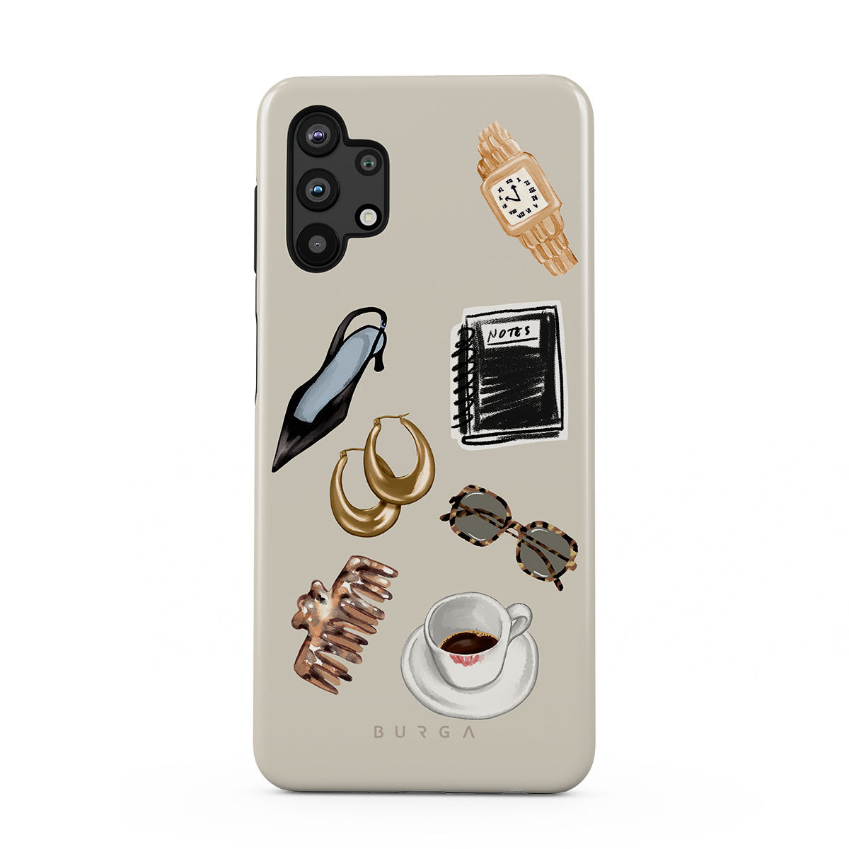 Questo design include: tacco alto nero, orecchini a cerchio dorati, taccuino nero, tazza di caffè, occhiali tartarugati, scrunchie marrone, orologio retrò dorato.
