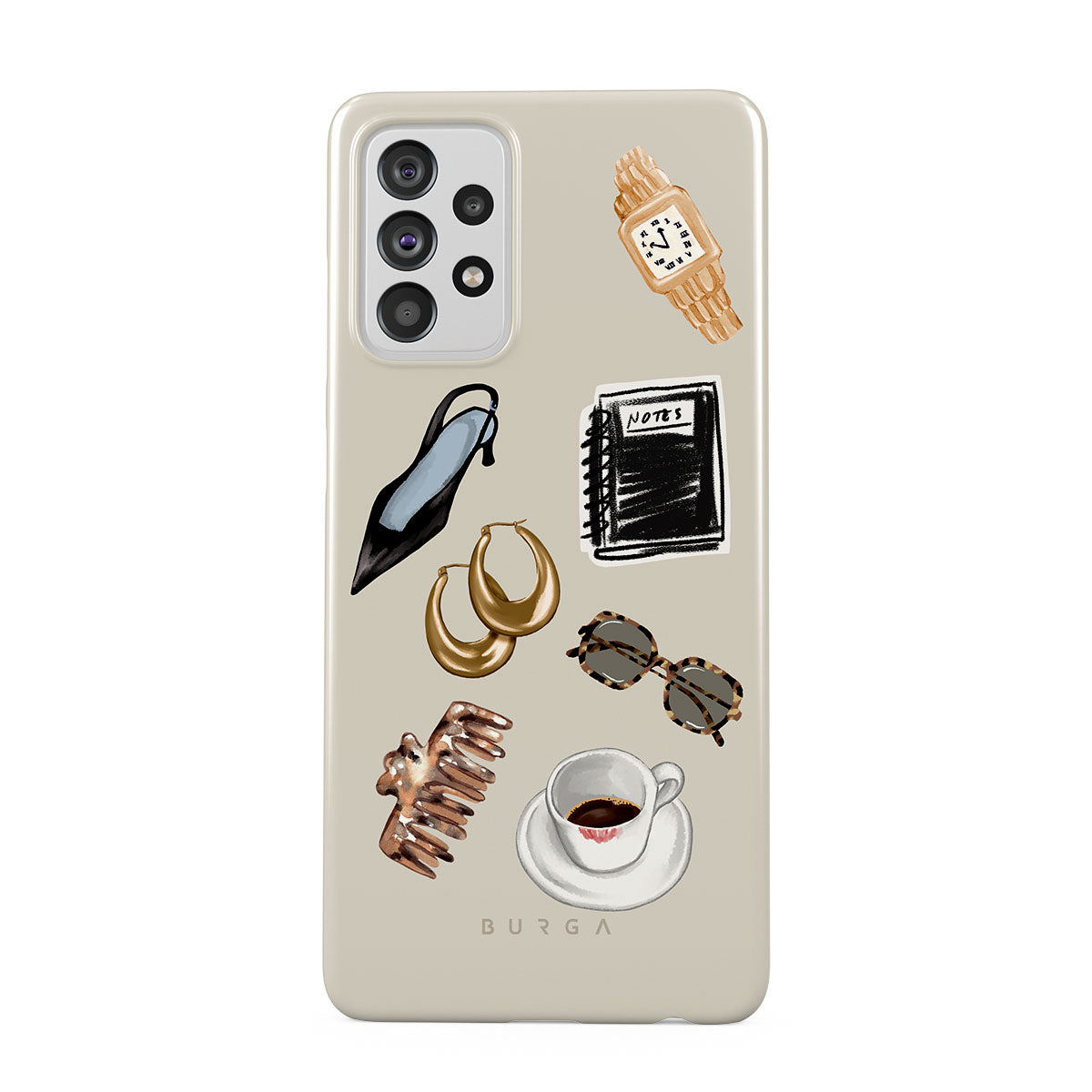 Questo design include: tacco alto nero, orecchini a cerchio dorati, taccuino nero, tazza di caffè, occhiali tartarugati, scrunchie marrone, orologio retrò dorato.