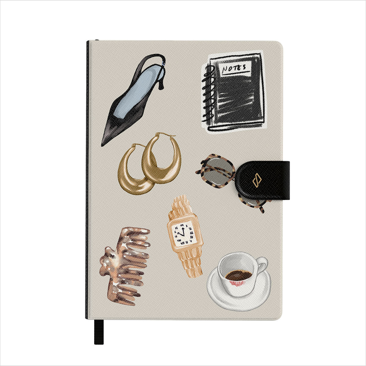 Questo design include: tacco alto nero, orecchini a cerchio dorati, taccuino nero, tazza di caffè, occhiali tartarugati, scrunchie marrone, orologio retrò dorato.