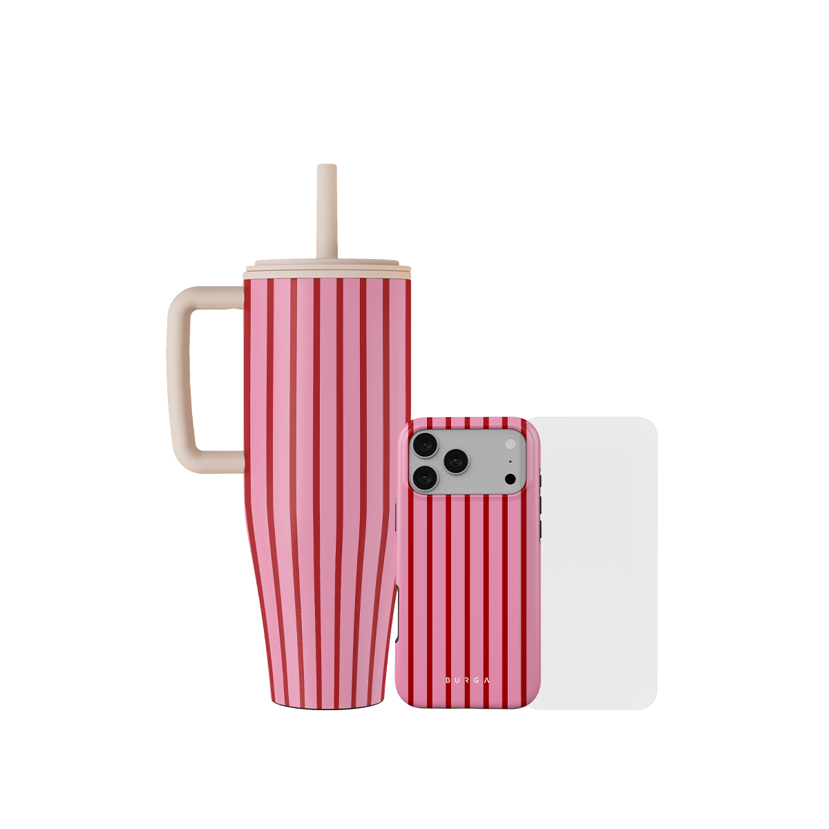 Per chi ama i risvegli lenti, il caffè caldo e il cellulare intatto. Questo set comprende una cover, una protezione per lo schermo e una tazza ermetica, tutte caratterizzate dall'iconico stile BURGA.