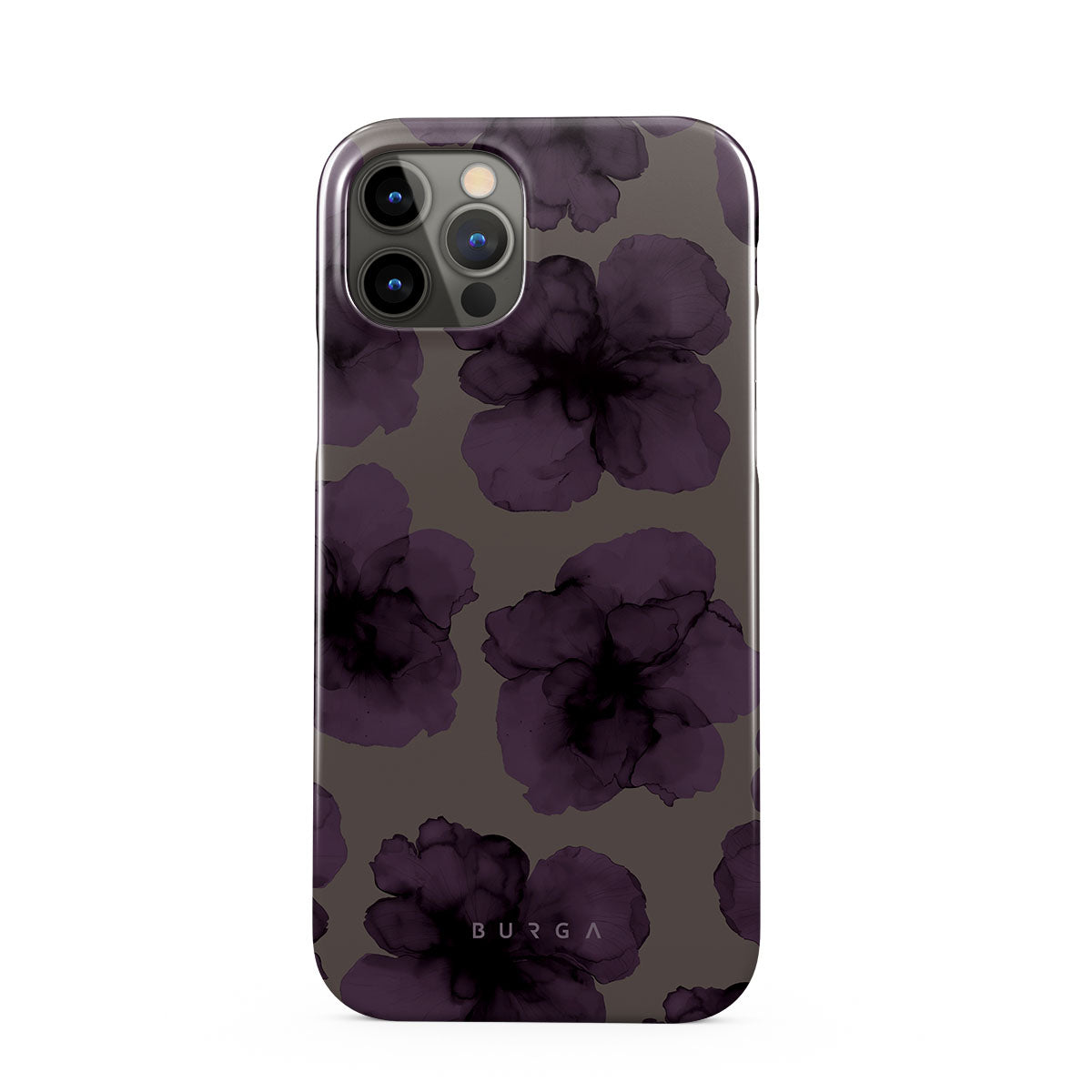 Questo design include: fiori scuri, fiori viola, petali violacei.