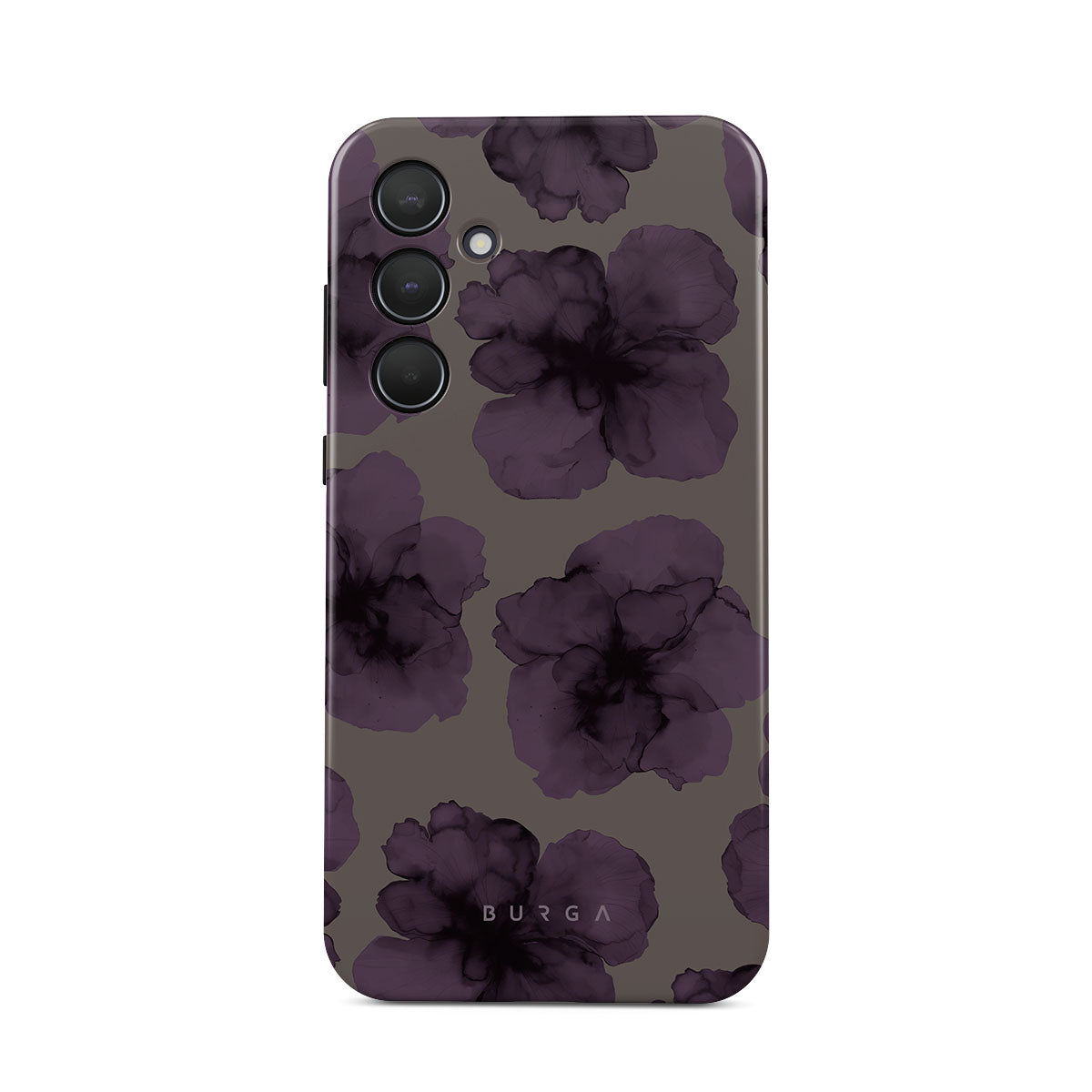 Questo design include: fiori scuri, fiori viola, petali violacei.