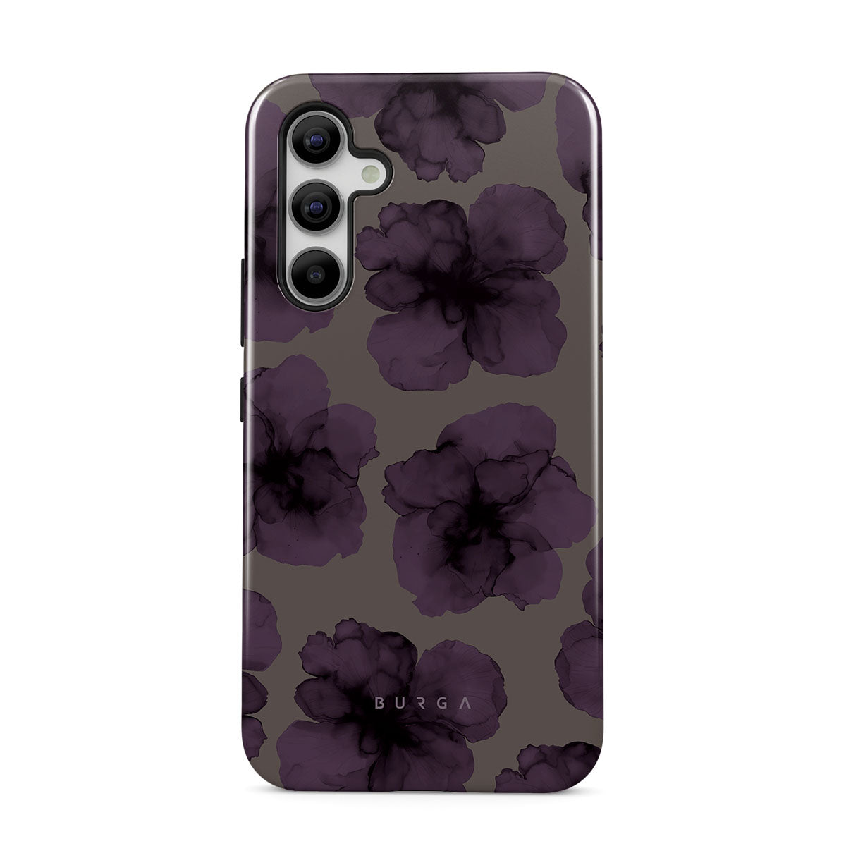 Questo design include: fiori scuri, fiori viola, petali violacei.