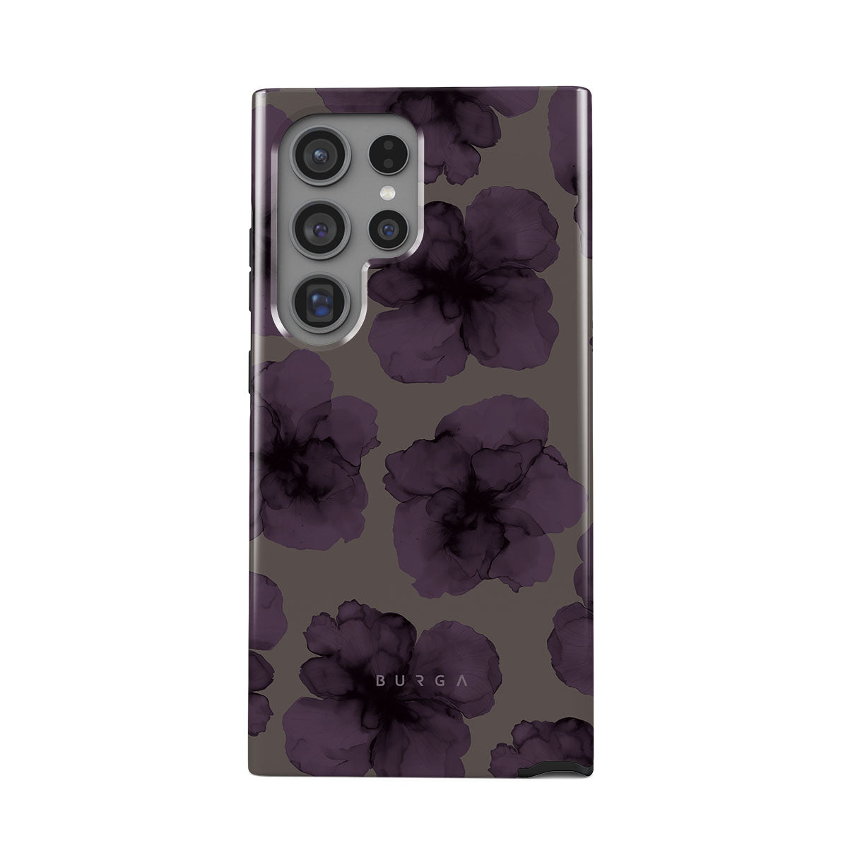 Questo design include: fiori scuri, fiori viola, petali violacei.