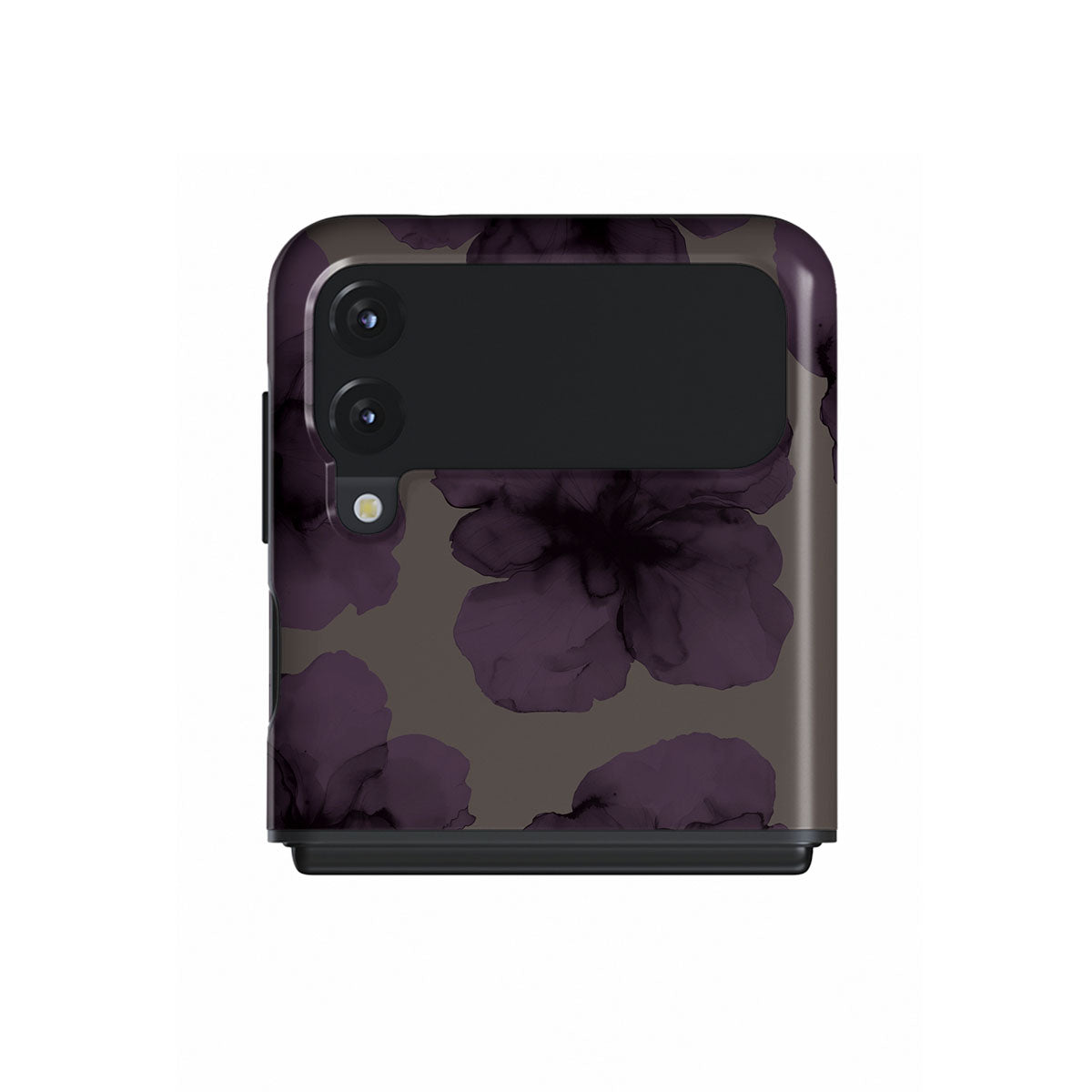 Questo design include: fiori scuri, fiori viola, petali violacei.