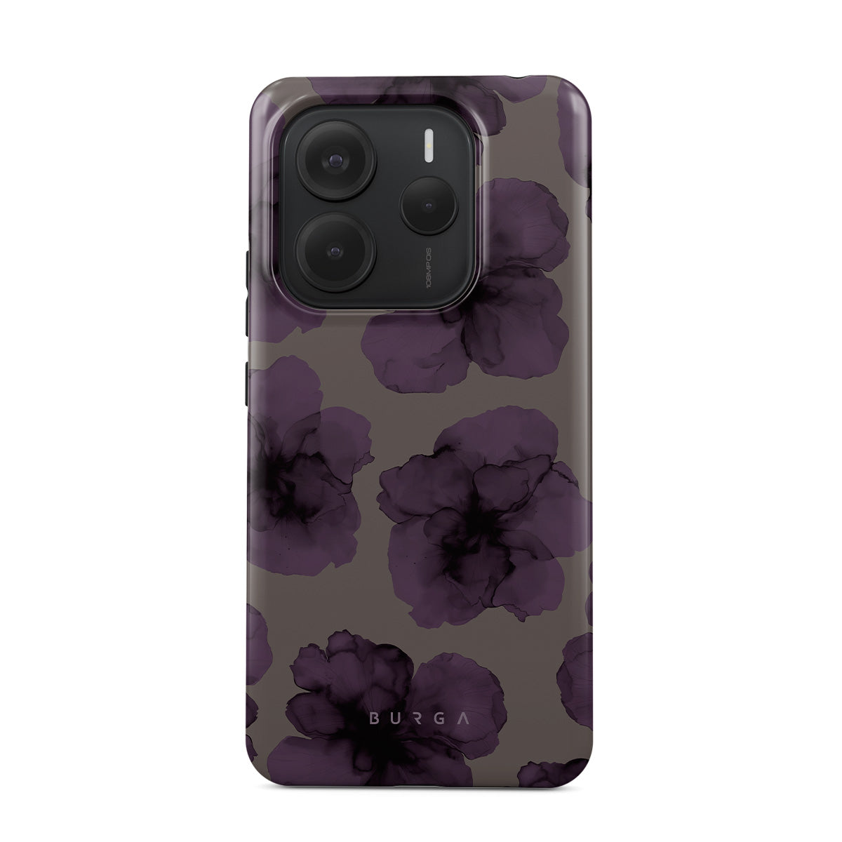 Questo design include: fiori scuri, fiori viola, petali violacei.