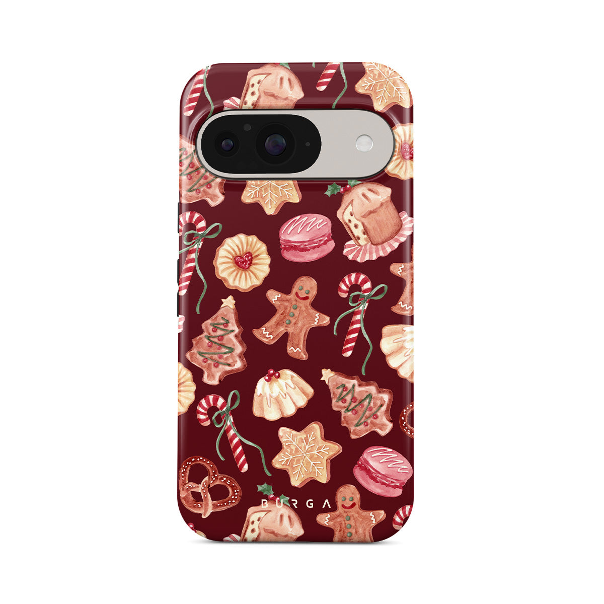 Questo design include: biscotti di Natale, uomini di pan di zenzero, bastoni di zucchero, caramelle alla menta, dolci festivi, sfondo rosso bordeaux