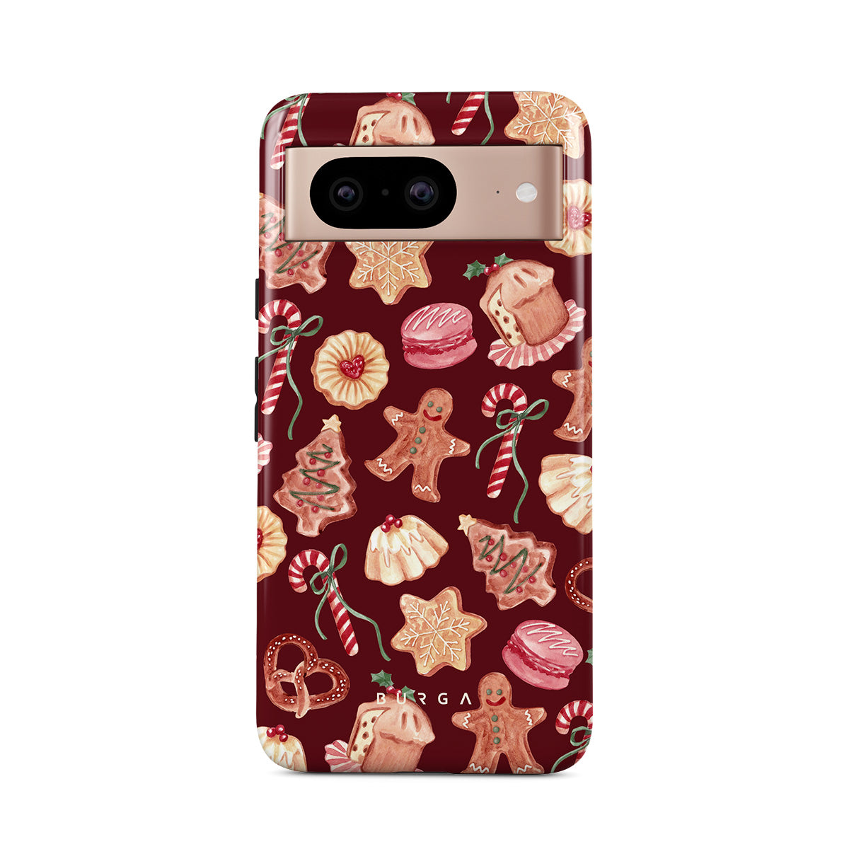 Questo design include: biscotti di Natale, uomini di pan di zenzero, bastoni di zucchero, caramelle alla menta, dolci festivi, sfondo rosso bordeaux