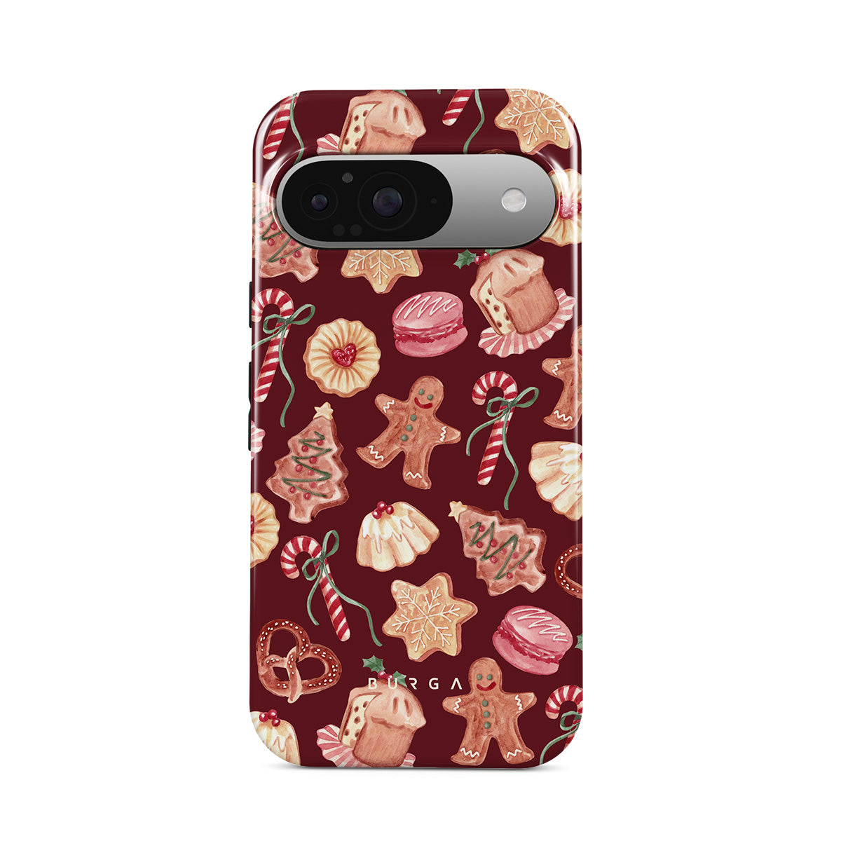 Questo design include: biscotti di Natale, uomini di pan di zenzero, bastoni di zucchero, caramelle alla menta, dolci festivi, sfondo rosso bordeaux