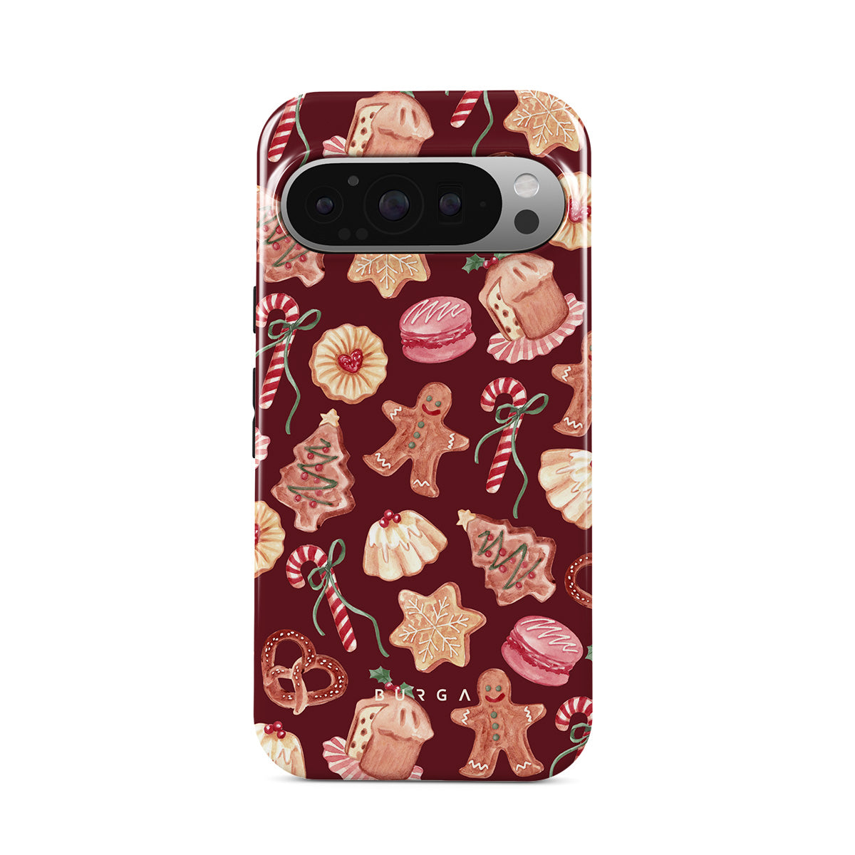 Questo design include: biscotti di Natale, uomini di pan di zenzero, bastoni di zucchero, caramelle alla menta, dolci festivi, sfondo rosso bordeaux