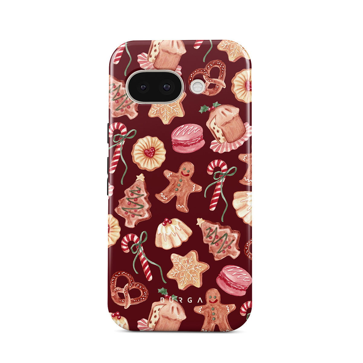 Questo design include: biscotti di Natale, uomini di pan di zenzero, bastoni di zucchero, caramelle alla menta, dolci festivi, sfondo rosso bordeaux
