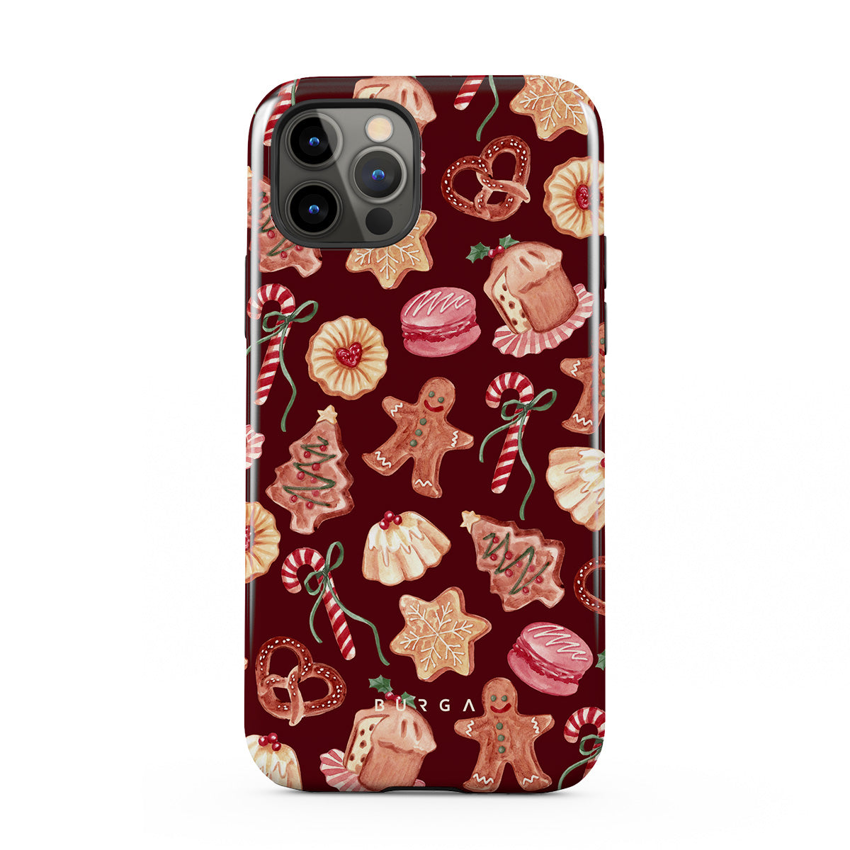 Questo design include: biscotti di Natale, uomini di pan di zenzero, bastoni di zucchero, caramelle alla menta, dolci festivi, sfondo rosso bordeaux