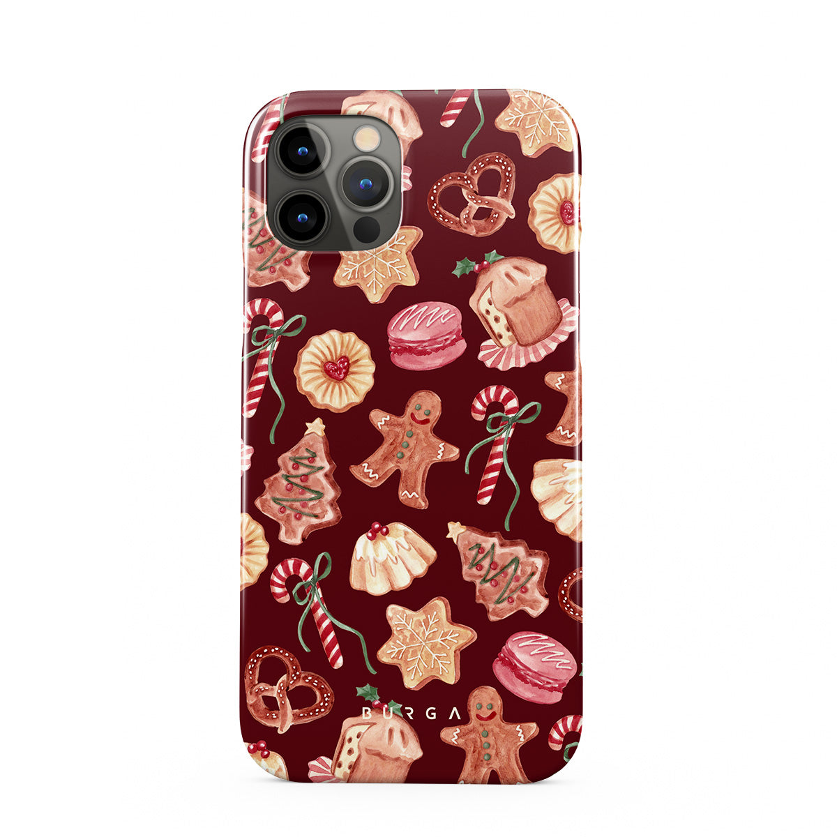 Questo design include: biscotti di Natale, uomini di pan di zenzero, bastoni di zucchero, caramelle alla menta, dolci festivi, sfondo rosso bordeaux