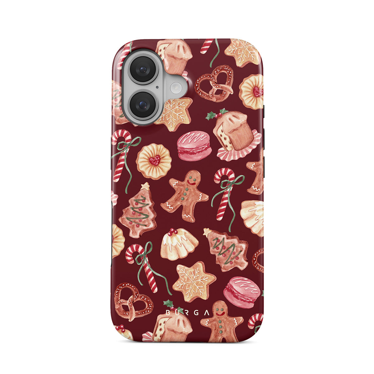 Questo design include: biscotti di Natale, uomini di pan di zenzero, bastoni di zucchero, caramelle alla menta, dolci festivi, sfondo rosso bordeaux