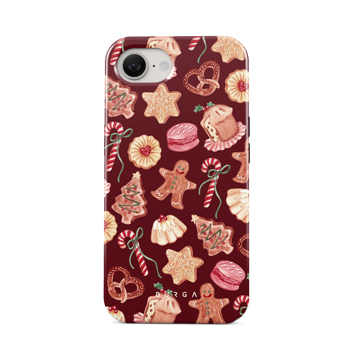 Questo design include: biscotti di Natale, uomini di pan di zenzero, bastoni di zucchero, caramelle alla menta, dolci festivi, sfondo rosso bordeaux