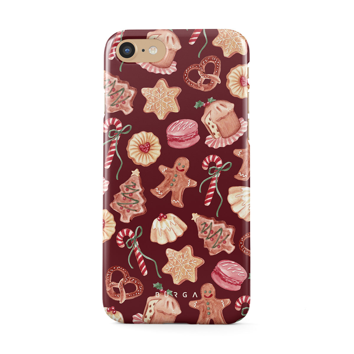 Questo design include: biscotti di Natale, uomini di pan di zenzero, bastoni di zucchero, caramelle alla menta, dolci festivi, sfondo rosso bordeaux