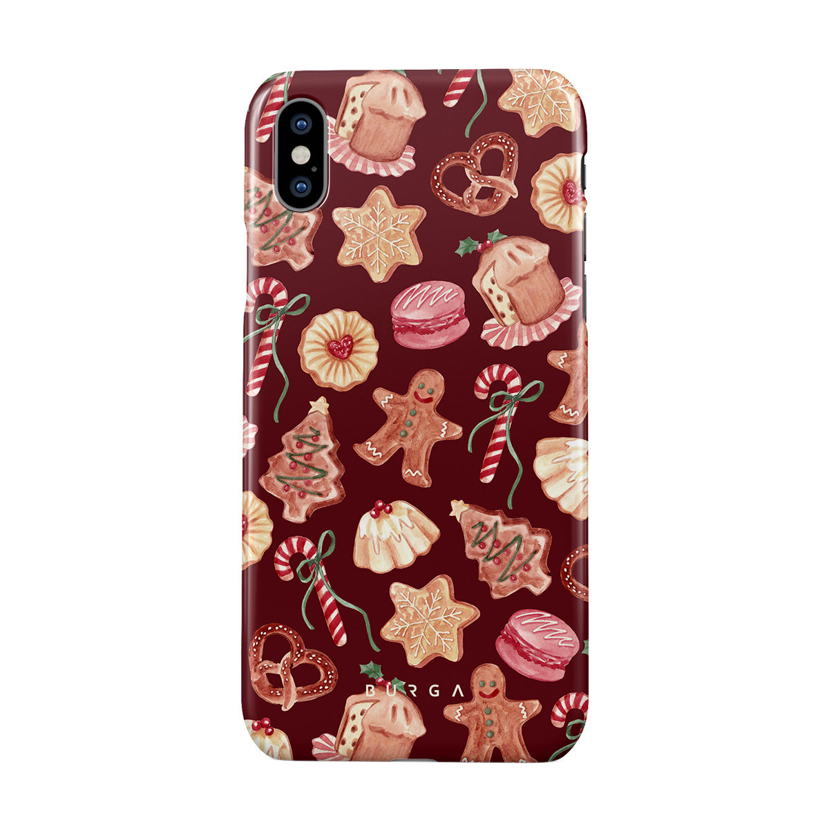 Questo design include: biscotti di Natale, uomini di pan di zenzero, bastoni di zucchero, caramelle alla menta, dolci festivi, sfondo rosso bordeaux