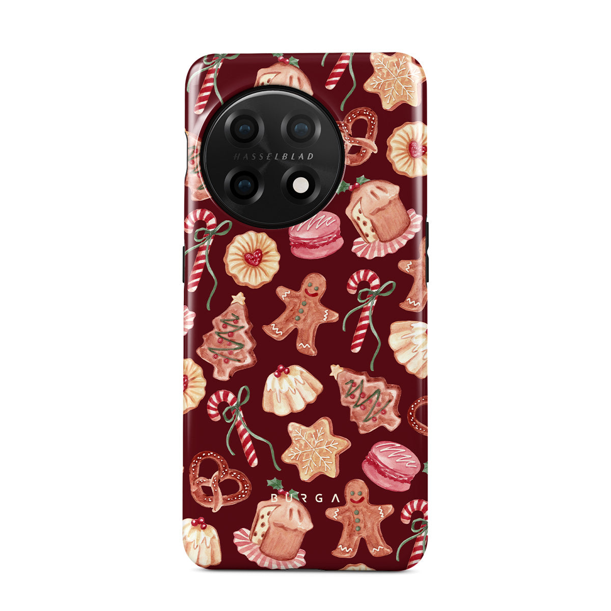 Questo design include: biscotti di Natale, uomini di pan di zenzero, bastoni di zucchero, caramelle alla menta, dolci festivi, sfondo rosso bordeaux