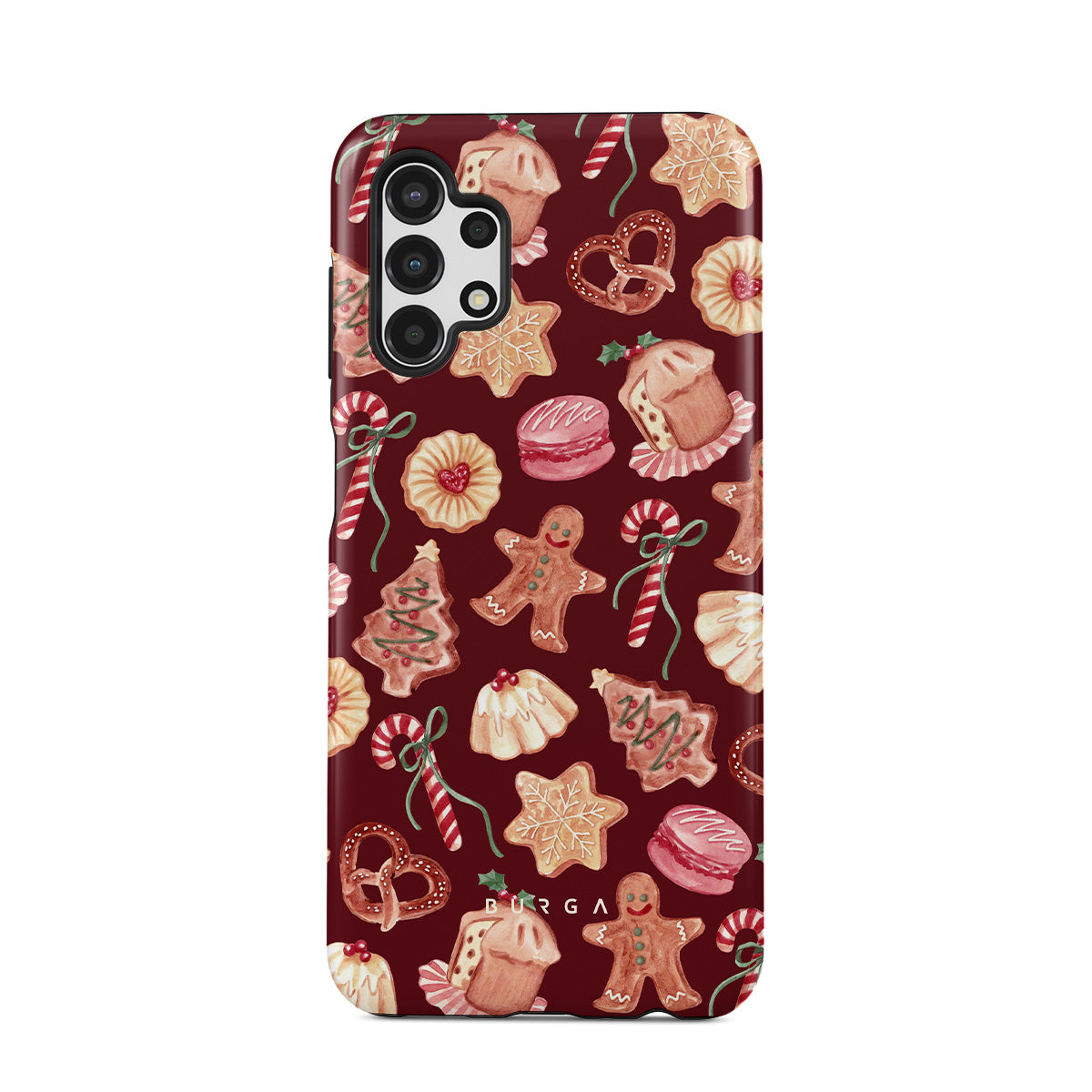 Questo design include: biscotti di Natale, uomini di pan di zenzero, bastoni di zucchero, caramelle alla menta, dolci festivi, sfondo rosso bordeaux