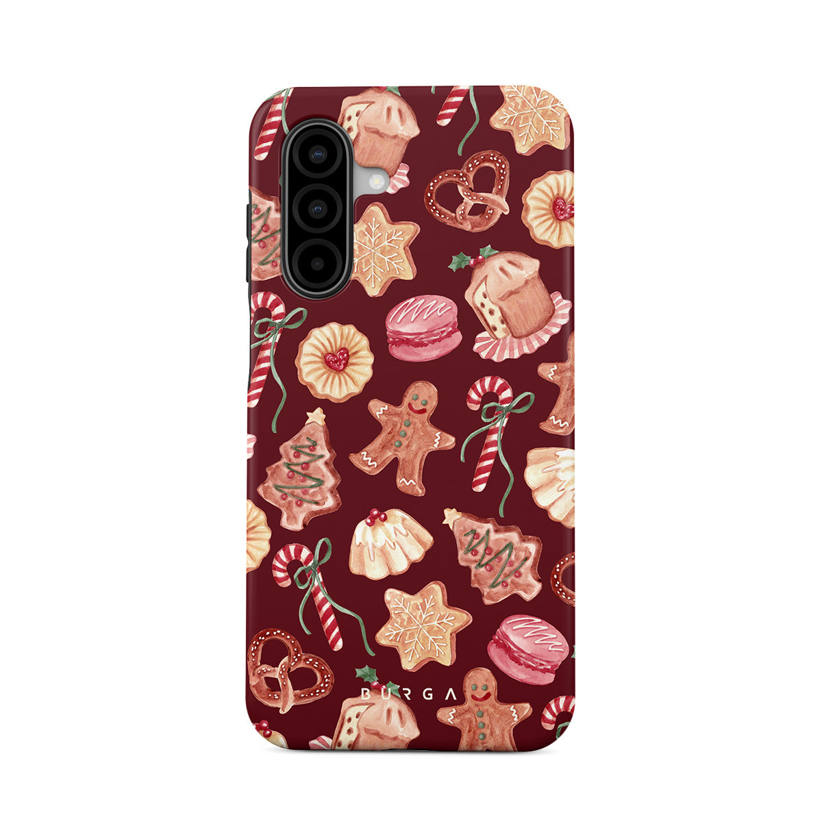 Questo design include: biscotti di Natale, uomini di pan di zenzero, bastoni di zucchero, caramelle alla menta, dolci festivi, sfondo rosso bordeaux