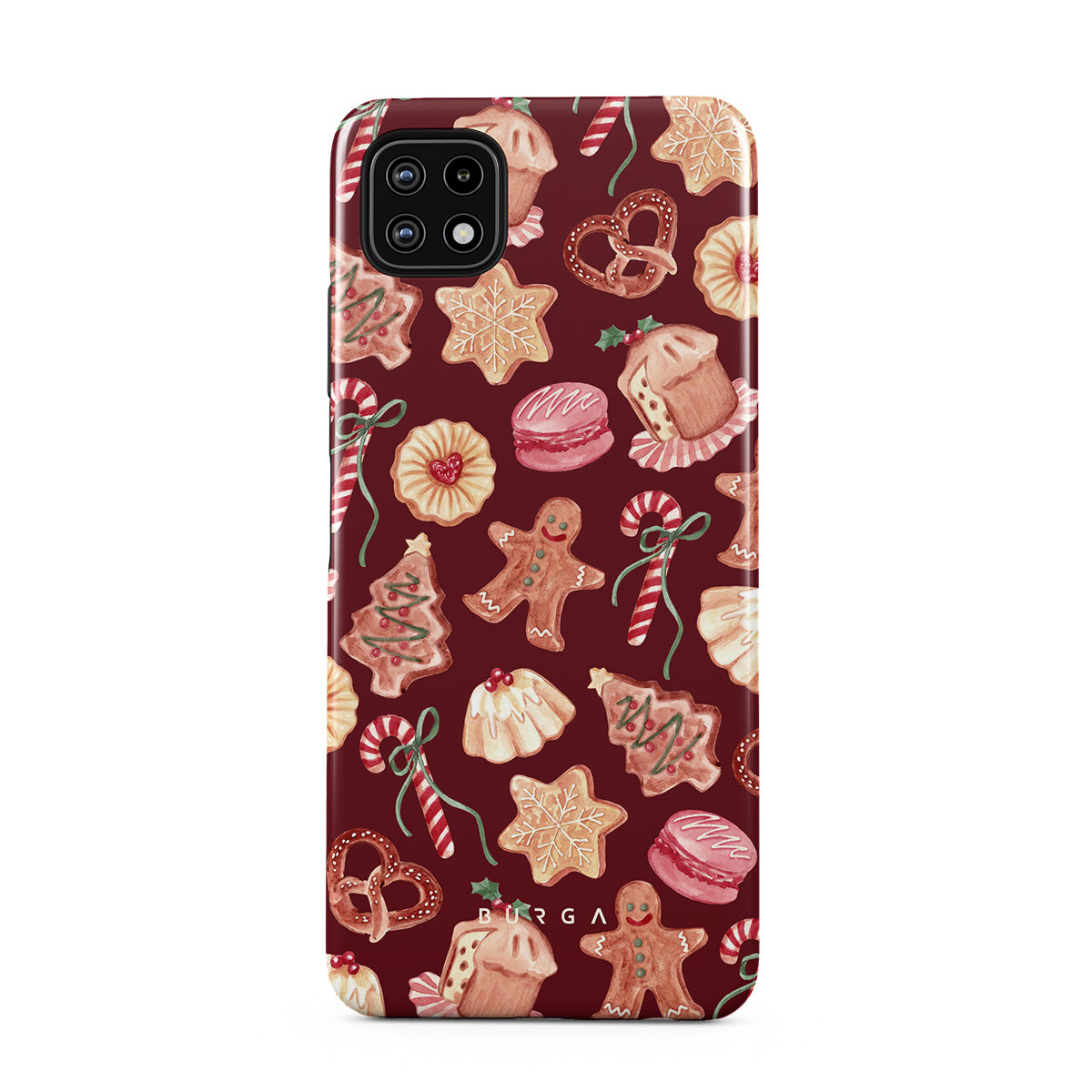 Questo design include: biscotti di Natale, uomini di pan di zenzero, bastoni di zucchero, caramelle alla menta, dolci festivi, sfondo rosso bordeaux
