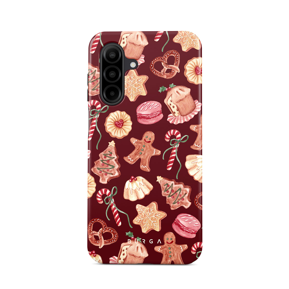 Questo design include: biscotti di Natale, uomini di pan di zenzero, bastoni di zucchero, caramelle alla menta, dolci festivi, sfondo rosso bordeaux