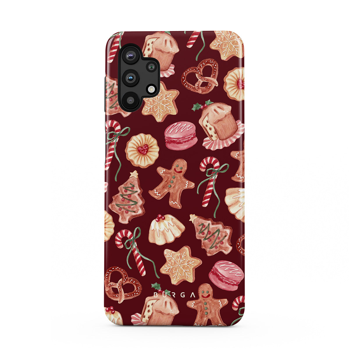 Questo design include: biscotti di Natale, uomini di pan di zenzero, bastoni di zucchero, caramelle alla menta, dolci festivi, sfondo rosso bordeaux