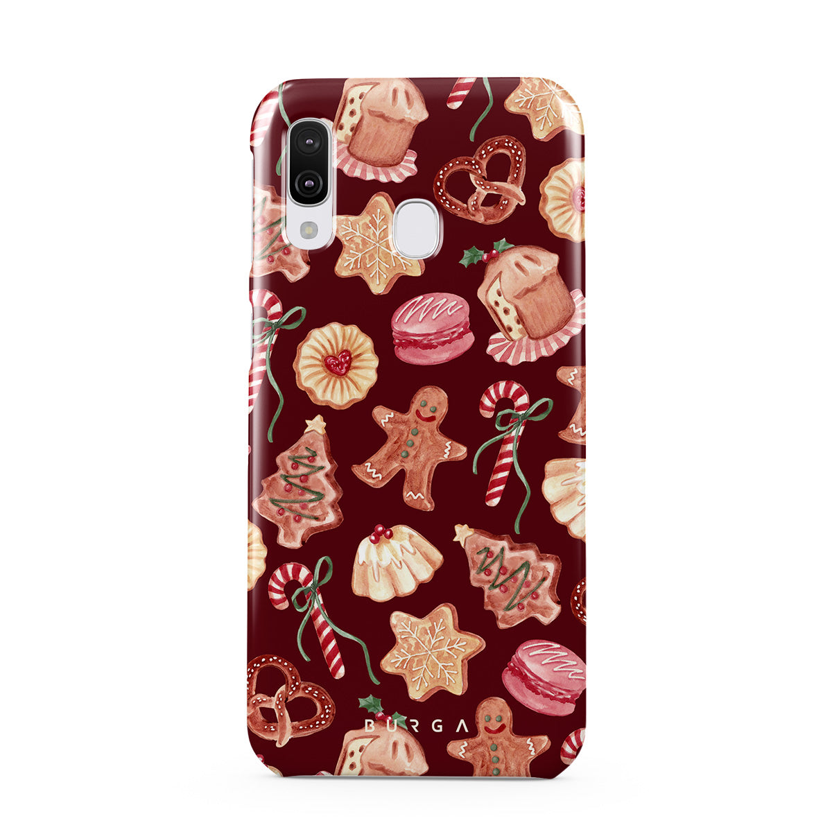 Questo design include: biscotti di Natale, uomini di pan di zenzero, bastoni di zucchero, caramelle alla menta, dolci festivi, sfondo rosso bordeaux