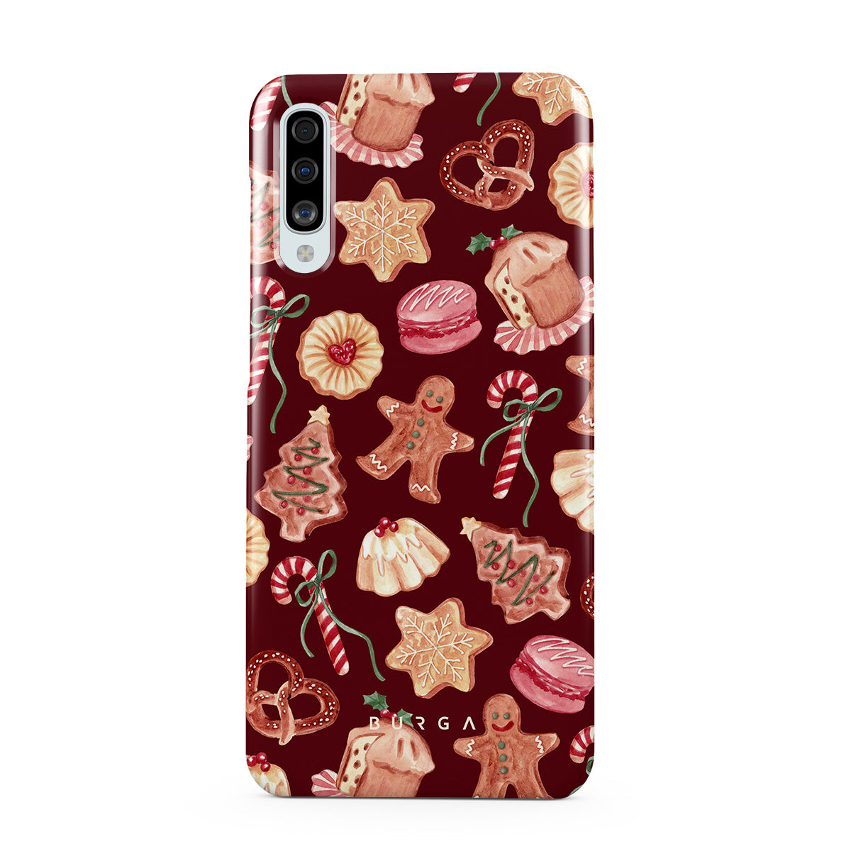 Questo design include: biscotti di Natale, uomini di pan di zenzero, bastoni di zucchero, caramelle alla menta, dolci festivi, sfondo rosso bordeaux