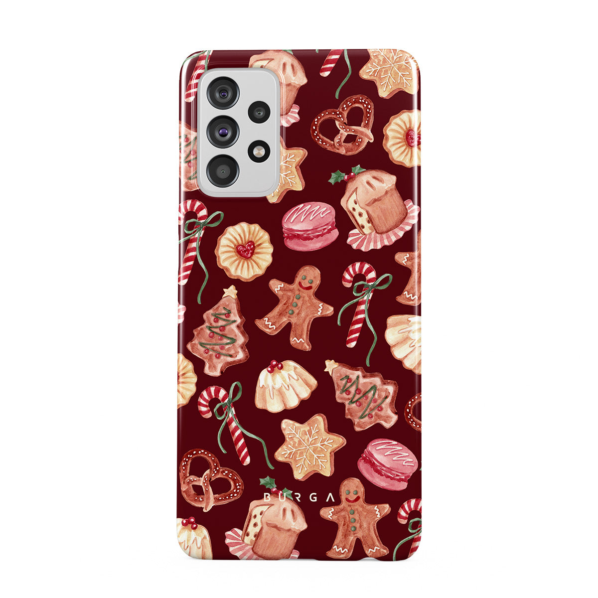 Questo design include: biscotti di Natale, uomini di pan di zenzero, bastoni di zucchero, caramelle alla menta, dolci festivi, sfondo rosso bordeaux