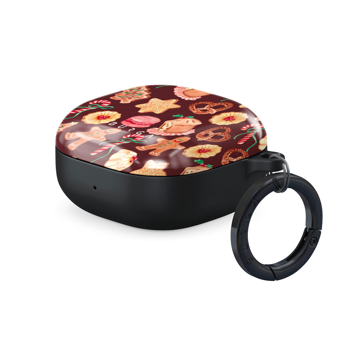 Questo design include: biscotti di Natale, uomini di pan di zenzero, bastoni di zucchero, caramelle alla menta, dolci festivi, sfondo rosso bordeaux