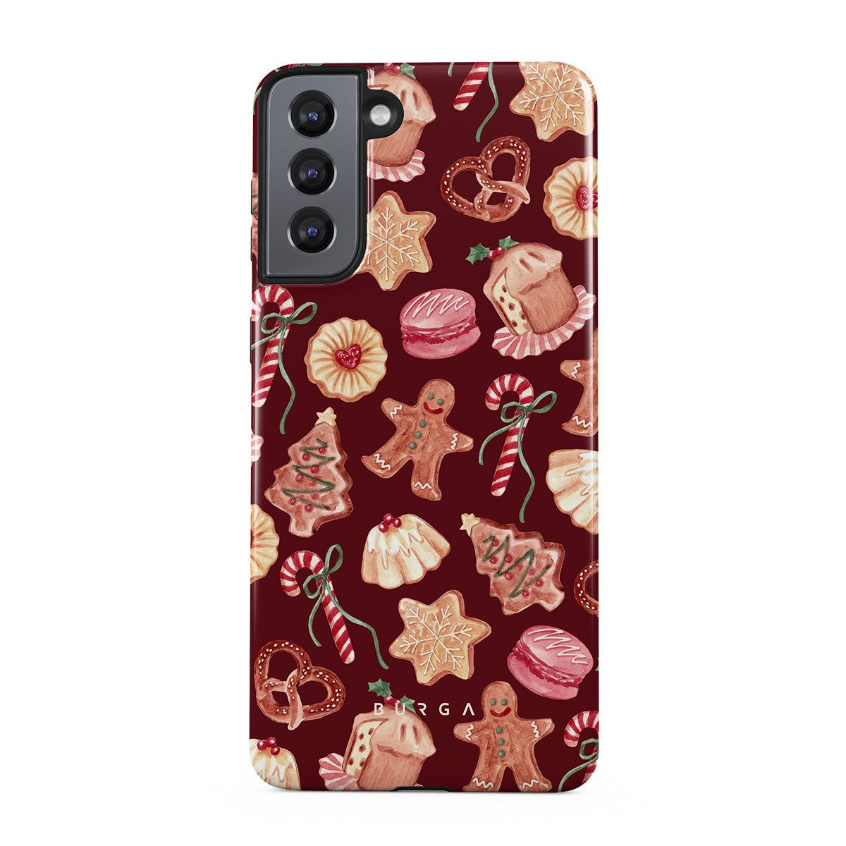 Questo design include: biscotti di Natale, uomini di pan di zenzero, bastoni di zucchero, caramelle alla menta, dolci festivi, sfondo rosso bordeaux