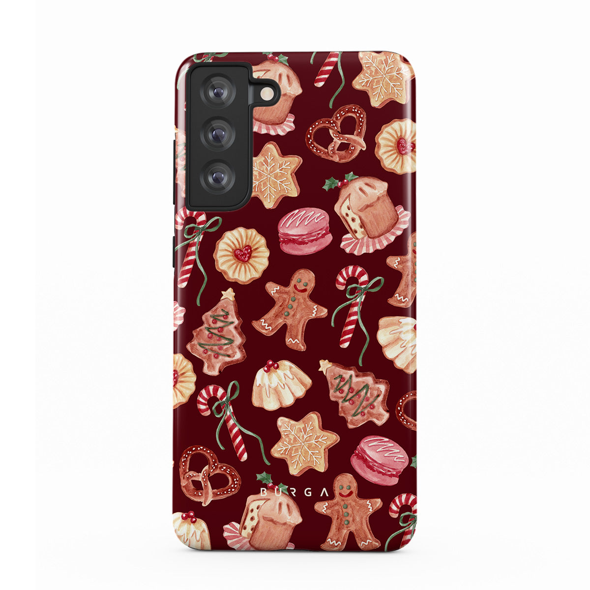 Questo design include: biscotti di Natale, uomini di pan di zenzero, bastoni di zucchero, caramelle alla menta, dolci festivi, sfondo rosso bordeaux