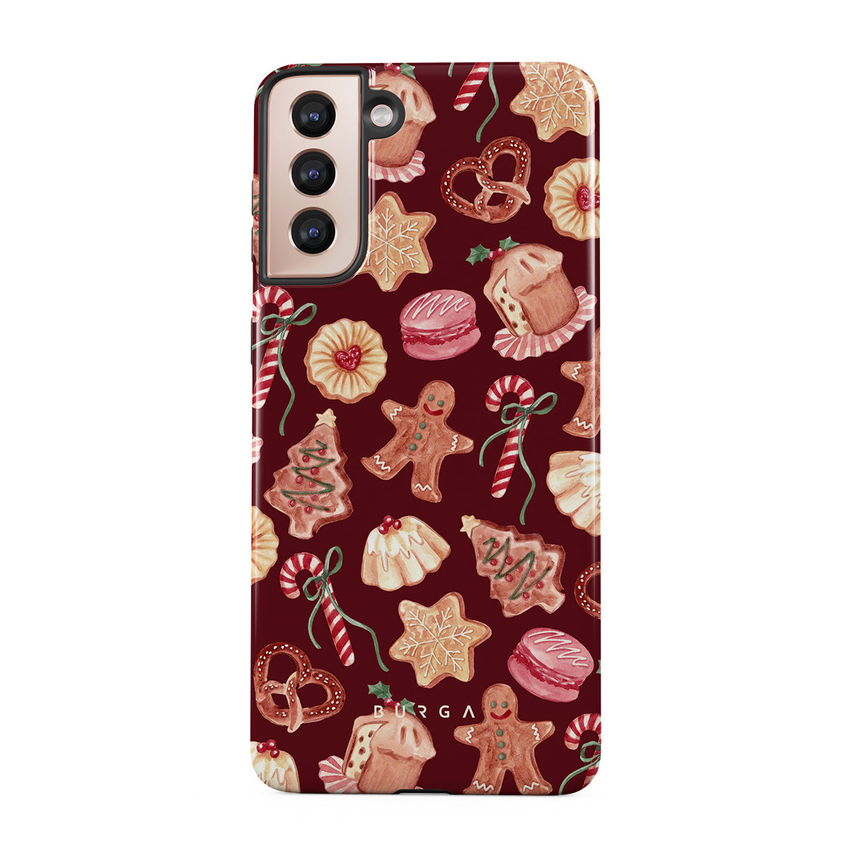 Questo design include: biscotti di Natale, uomini di pan di zenzero, bastoni di zucchero, caramelle alla menta, dolci festivi, sfondo rosso bordeaux