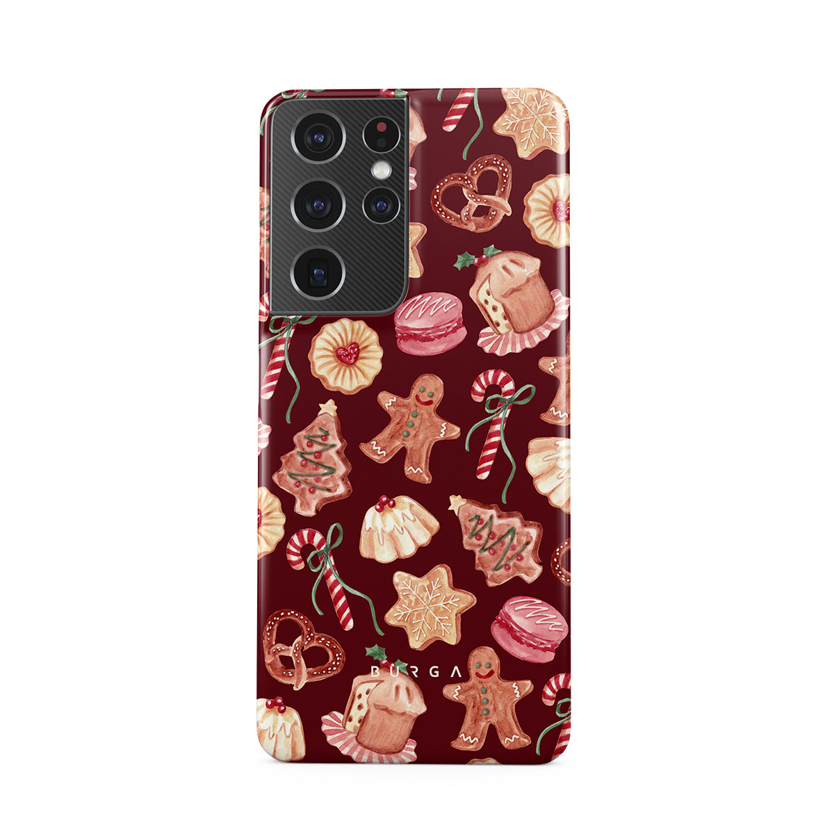 Questo design include: biscotti di Natale, uomini di pan di zenzero, bastoni di zucchero, caramelle alla menta, dolci festivi, sfondo rosso bordeaux
