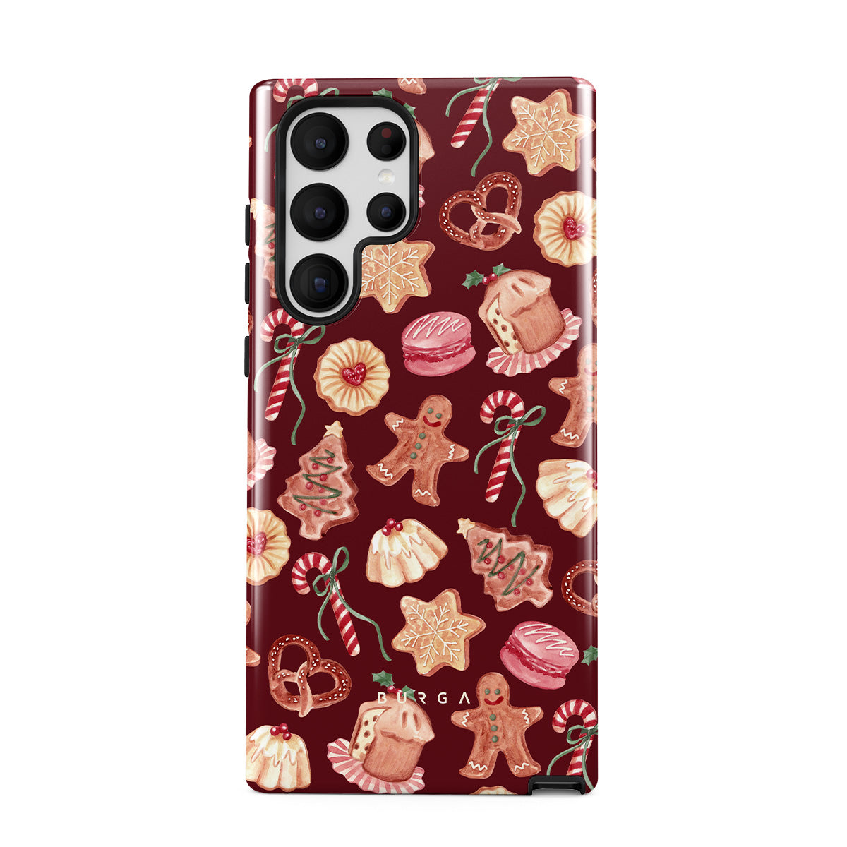 Questo design include: biscotti di Natale, uomini di pan di zenzero, bastoni di zucchero, caramelle alla menta, dolci festivi, sfondo rosso bordeaux