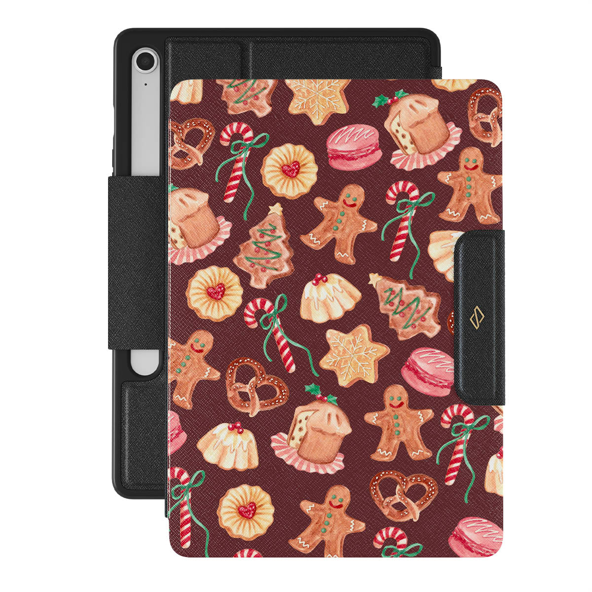 Questo design include: biscotti di Natale, uomini di pan di zenzero, bastoni di zucchero, caramelle alla menta, dolci festivi, sfondo rosso bordeaux
