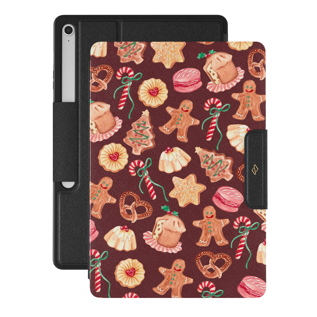 Questo design include: biscotti di Natale, uomini di pan di zenzero, bastoni di zucchero, caramelle alla menta, dolci festivi, sfondo rosso bordeaux