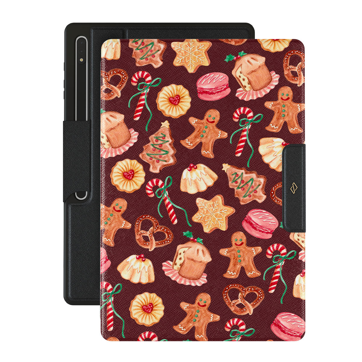 Questo design include: biscotti di Natale, uomini di pan di zenzero, bastoni di zucchero, caramelle alla menta, dolci festivi, sfondo rosso bordeaux