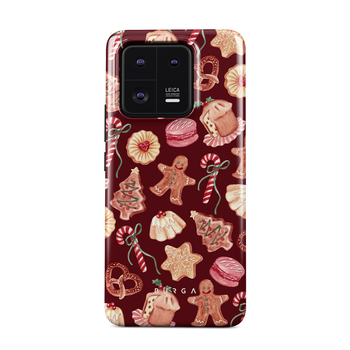 Questo design include: biscotti di Natale, uomini di pan di zenzero, bastoni di zucchero, caramelle alla menta, dolci festivi, sfondo rosso bordeaux