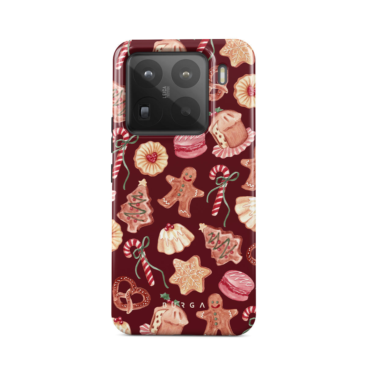 Questo design include: biscotti di Natale, uomini di pan di zenzero, bastoni di zucchero, caramelle alla menta, dolci festivi, sfondo rosso bordeaux