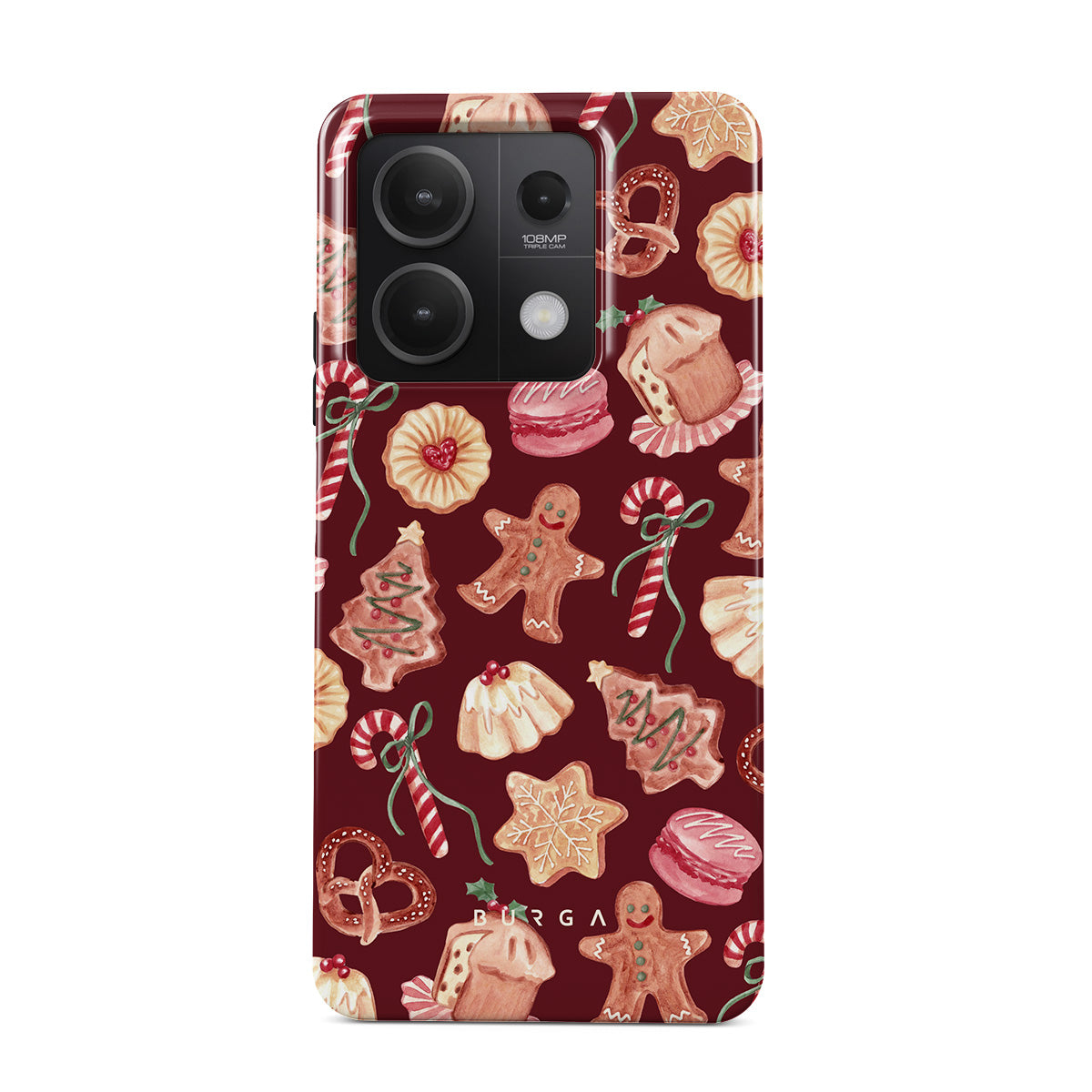 Questo design include: biscotti di Natale, uomini di pan di zenzero, bastoni di zucchero, caramelle alla menta, dolci festivi, sfondo rosso bordeaux